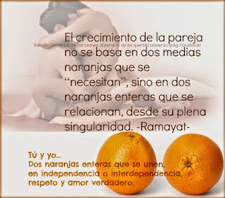 "El crecimiento de la pareja no se basa en dos medias naranjas que se "necesitan", sino en dos naranjas enteras que se relacionan desde su plena singularidad. Tú y yo ...dos naranjas enteras que se unen en independencia o interdependencia, respeto y amor verdadero"